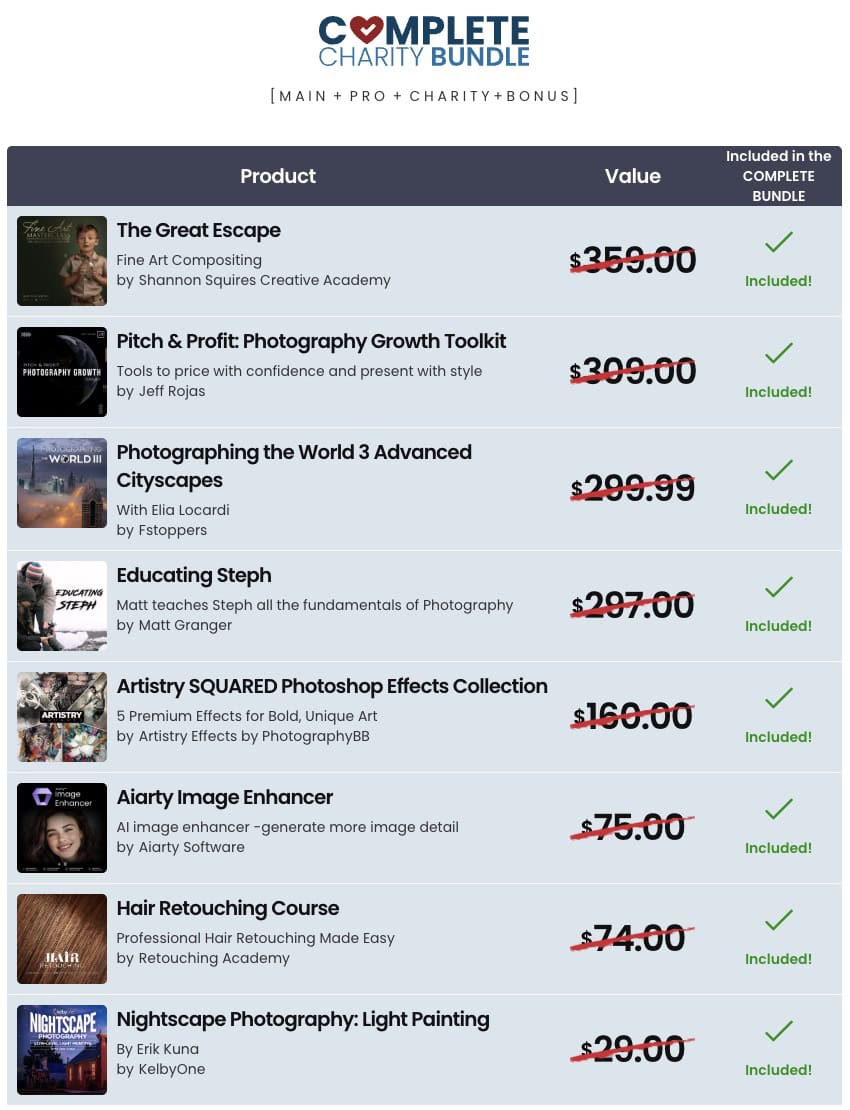During the pre-sale period, the main bundle and each add-on are discounted by $5, for a total savings of $15 if you choose the Complete Bundle. Let’s break it down: For $98 $93, you get all the products in the main bundle, listed below, valued at over $1000. The Pro Bundle add-on costs an extra $49 $44, but it provides over $1000 worth of additional products. The charity bonus add-on is an extra $39 $34, but it also includes products worth over $1000. If you purchase the complete bundle (Main+Pro+Charity), you will also receive the bonus add-on valued at over $500.