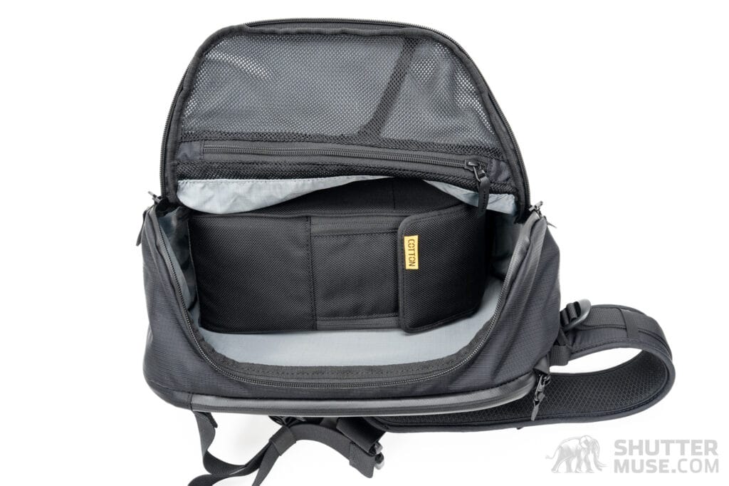 Perhaps most impressive to me, since I’m already familiar with the convenience and comfort of Cotton Carrier’s other camera harnesses, is the cleverly designed sling bag portion of the Hyker. They could have opted for a simple bag with one large main pocket for gear. Instead, the designers created a sling with incredibly intricate internal compartmentalization that uses three separate zippered compartments and a divider system to create four distinct internal areas for storage.