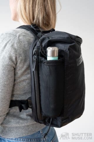 Opening the bottom of the pocket and carefully, tightly positioning the two cinch straps allows you to carry a lightweight travel tripod. I tested this using the Peak Design Travel Tripod and used the lip of the leg locks to hook onto the top of the side pocket to prevent it from slipping too far through the side pocket. You should be able to use a similar technique with most smaller tripods, but I wouldn’t recommend using it for anything larger than a compact travel tripod.
