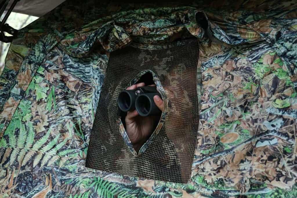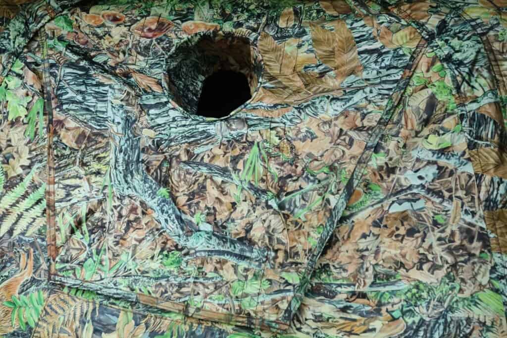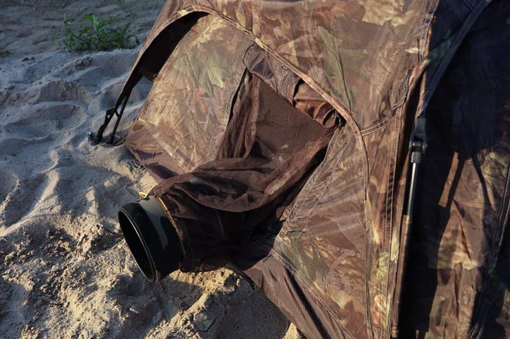 A dedicated photography blind will not only have specially shaped holes and hoods for long lenses, but it will also have openings on all sides at both eye level and ground level, allowing you to get those low-level shots that look so good. A good photography blind will also take into account the fact that you’ll most likely be using a tripod, and allow for the extension of a tripod leg through the wall of the blind so that you can position the camera and lens up against the interior wall.